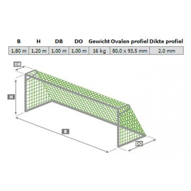 Aluminium voetbaldoel met afm. 180 x 120 cm. (gekanteld 100 cm. hoog). Een kanteldoel kan zoals de naam al zegt gekanteld worden, waardoor de doelgrootte verkleint of vergroot.
