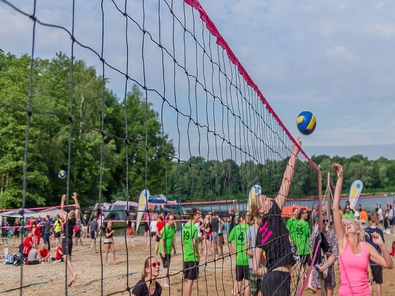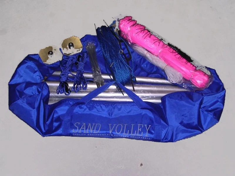 Comnplete set in handige draagtas. Compleet met beachvolleybalnet, veldmarkeringslijnen, set palen, spanlijnen en haringen.
