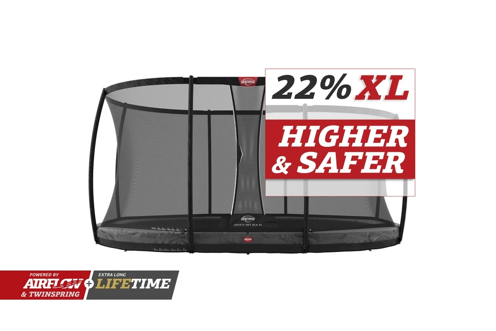 De BERG Grand Champion is de grootste trampoline in het assortiment van BERG. Ovaal van vorm brengt deze trampoline het beste van 2 werelden; het springcomfort van een langwerpige trampoline door het springen in een springlijn en daarnaast de sterkte van een gebogen frame. Voor het beste springcomfort uitgerust met de Berg Twinspring gold veren en de Airflow springmat. Compleet met het veiligheidsnet DLX XL. Dit safety net is maar liefst 220 cm. hoog i.p.v. 180 cm. en biedt daarmee maximale veiligheid