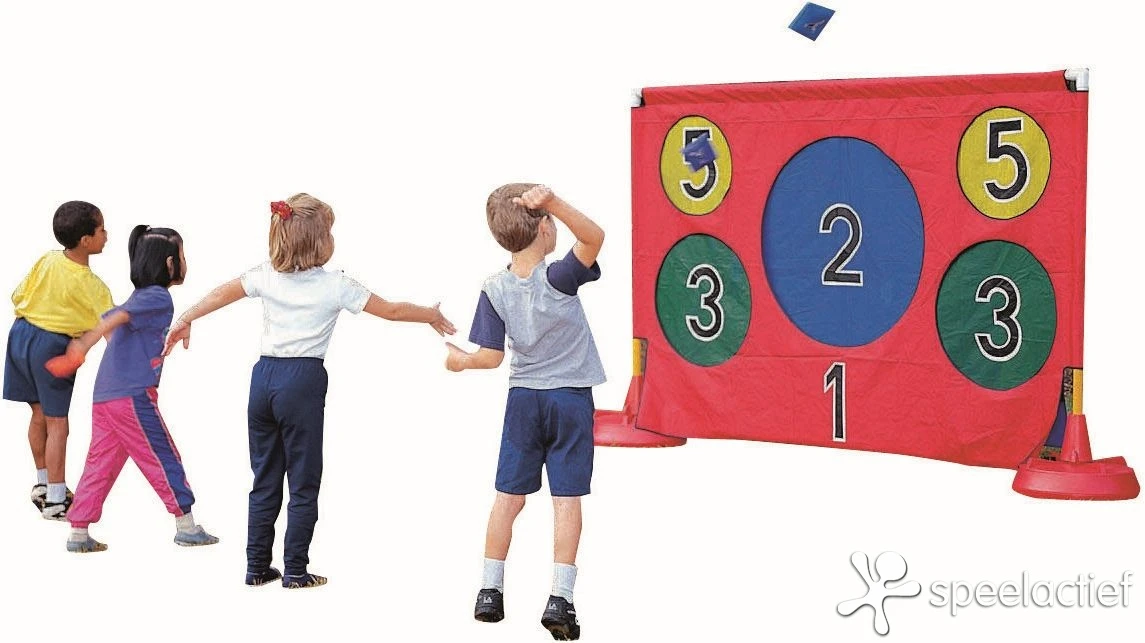 Deze muur, die uitgevoerd is in zeer sterk vinyl overtrokken met nylon, wordt bevestigd op de hoge paal. Zo kunnen kinderen hun behendigheid in het werpen en schieten ontwikkelen. Men kan alle traditionele ballen gebruiken, maar ook ballen van schuim, graanzakken, enz… De zones zijn genummerd waardoor de kinderen de geldige treffers kunnen optellen. Afmetingen: 260x170cm.