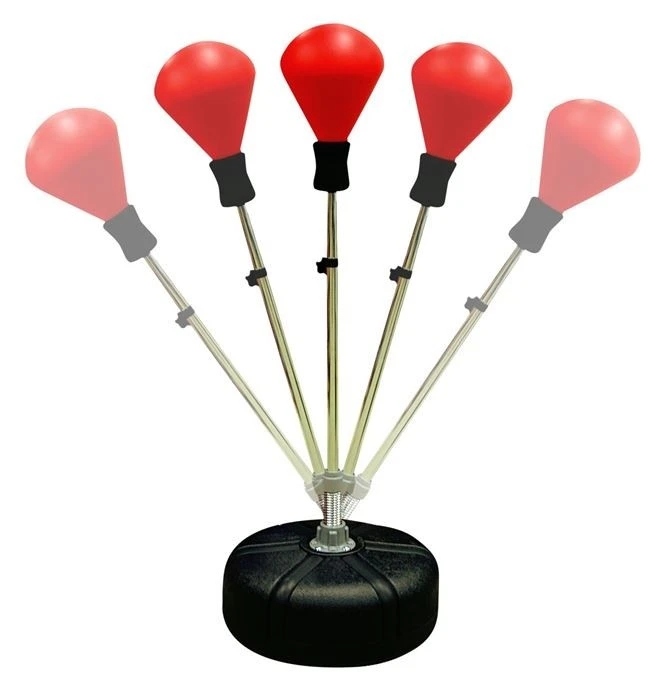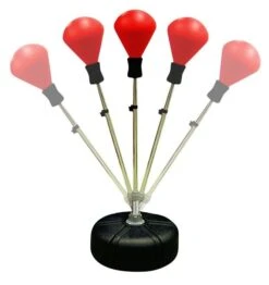 Boksbal met eronder een extra beschermer over de buis, stang in hoogte verstelbaar d.m.v. draaiknop en een sterke veer aan de onderzijde, sterke watercontainer/voetstuk (te vullen met water of zand)