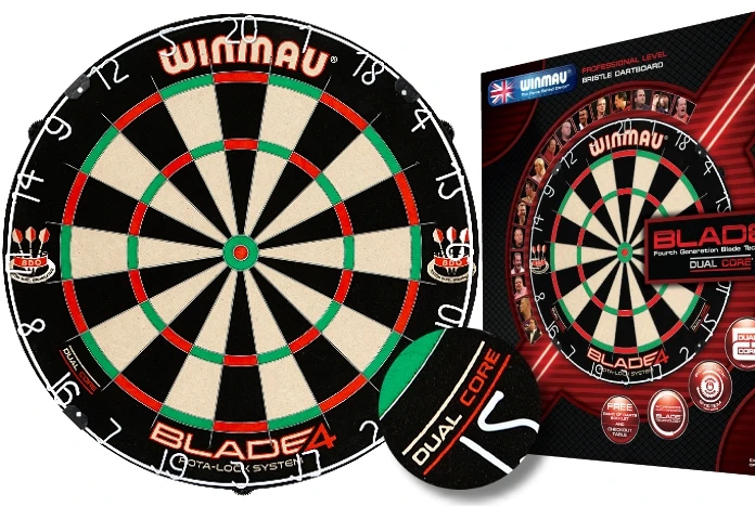 Dartbord Winmau Blade 4. Het nieuwe wedstrijd dartbord van Winmau met een zeer geavanceerd nieuw bedradingsysteem voor prestaties zonder weerga. Bezit 50% dunnere dynamische-sectorbedrading voor minder bounceouts en maximaal scoringspotentieel. Volledig kram-vrij systeem. Met gelakte anti-glans nummer ring. Een Bristle Sisal-basis voor de uiterste duurzaamheid met een lange levensduur, doordat de haren de gaatjes zelf dichten, superdicht, uiterst zichtbaar. Het fijnste dartbord met lage bounceout.