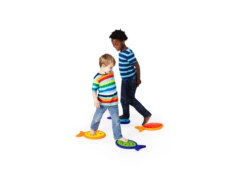 Maar de vissen kunnen ook gebruikt worden voor evenwichtsoefeningen. Door de vissen harder op te blazen, gaan ze enigszins bol staan waardoor het balanceren nog uitdagender wordt