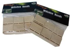 Echte aardappelen worden van het labnd gehaald en verzameld in grote houten kisten. Dit pakketje bevat 6 aardappelkisten op schaal 1 : 32.