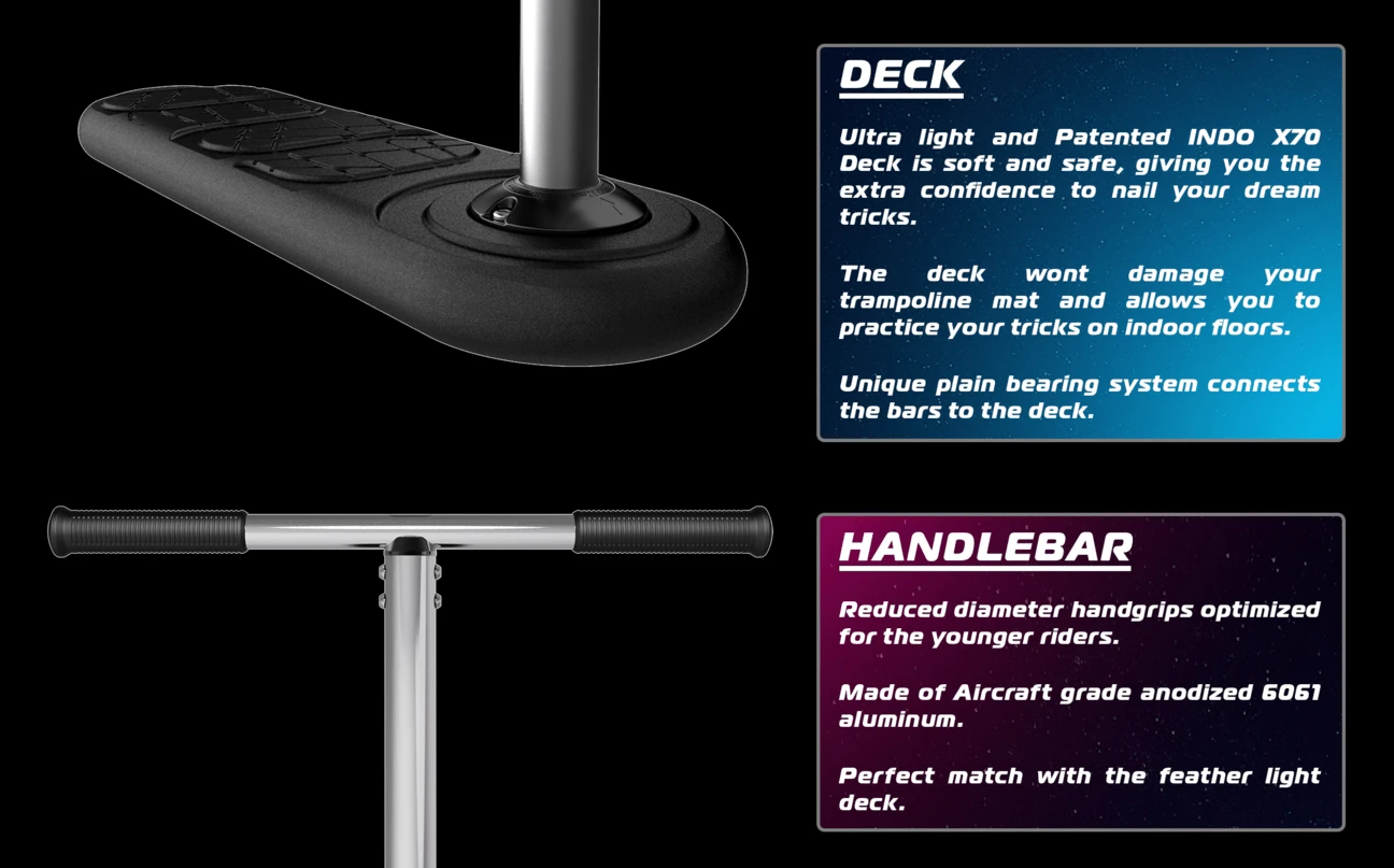 Een trampoline -scooter is een leuke manier om het trampoline springen een extra dimensie te geven! Met een Trick-scooter voor de trampoline kun je alle skateboard-, snowboard- en wakeboard- moves veilig oefenen! Deze trampo-step is geschikt voor jong en ouder.