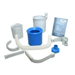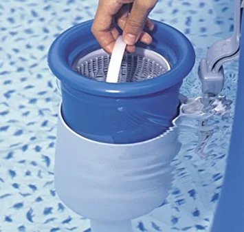 De skimmer wordt direct aangesloten op de filterpomp waardoor het oppervlaktewater gemakkelijk ontdaan wordt van bladeren etc. Het zeefje is eenvoudig uitneembaar.