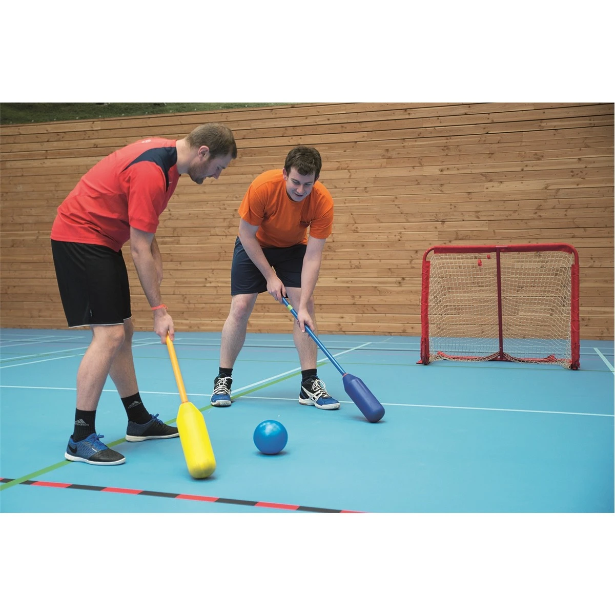 De set bevat 12 stokken (6 elk: blauw en geel) met rechte, foam koppen afgewerkt met olifantenhuid en 2 speelballen.