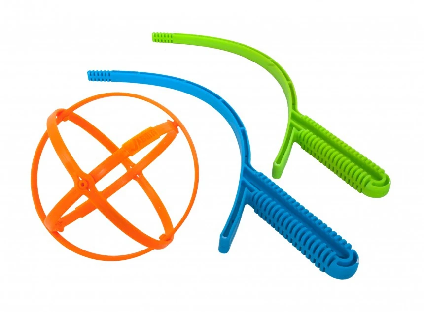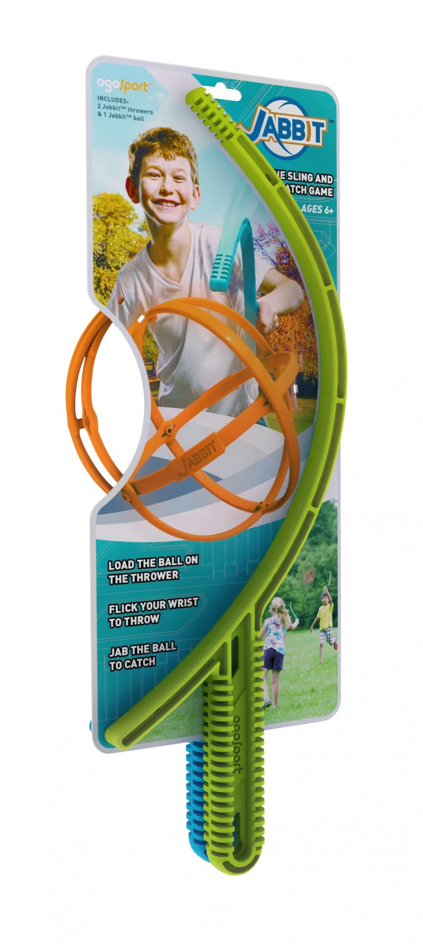Het nieuwe werp= en vangspel Jabbit van OGO bestaat uit 2 Jabbit katapulten (lengte 42 cm) gemaakt van stevig plastic en een bijbehorende bal. Haak de bal eenvoudig in een van de klaveren, reik uit met de arm en gooi de bal naar de andere speler. Het doel is dat de andere speler de bal vangt met zijn Jabbit-katapult en vervolgens weer speelt. Ogo Jabbit is een leuke uitdaging en veel plezier voor jong en oud; Werpafstanden voor kinderen van ongeveer 3-5 meter, voor volwassenen tot meer dan 10 meter. Overigens traint Jabbit ook oog-handcoördinatie en motoriek bij kinderen.