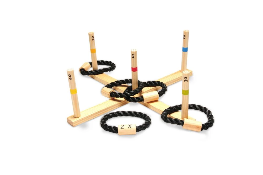 Ringgooien is een heerlijk traditioneel spel bestaande uit 1 kruis inclusief 5 pinnen en 5 werp ringen. Gemaakt van rubberthout. Het spel wordt geleverd in een colourbox, inclusief meertalige spelregels. Gewicht: 1,2 kg