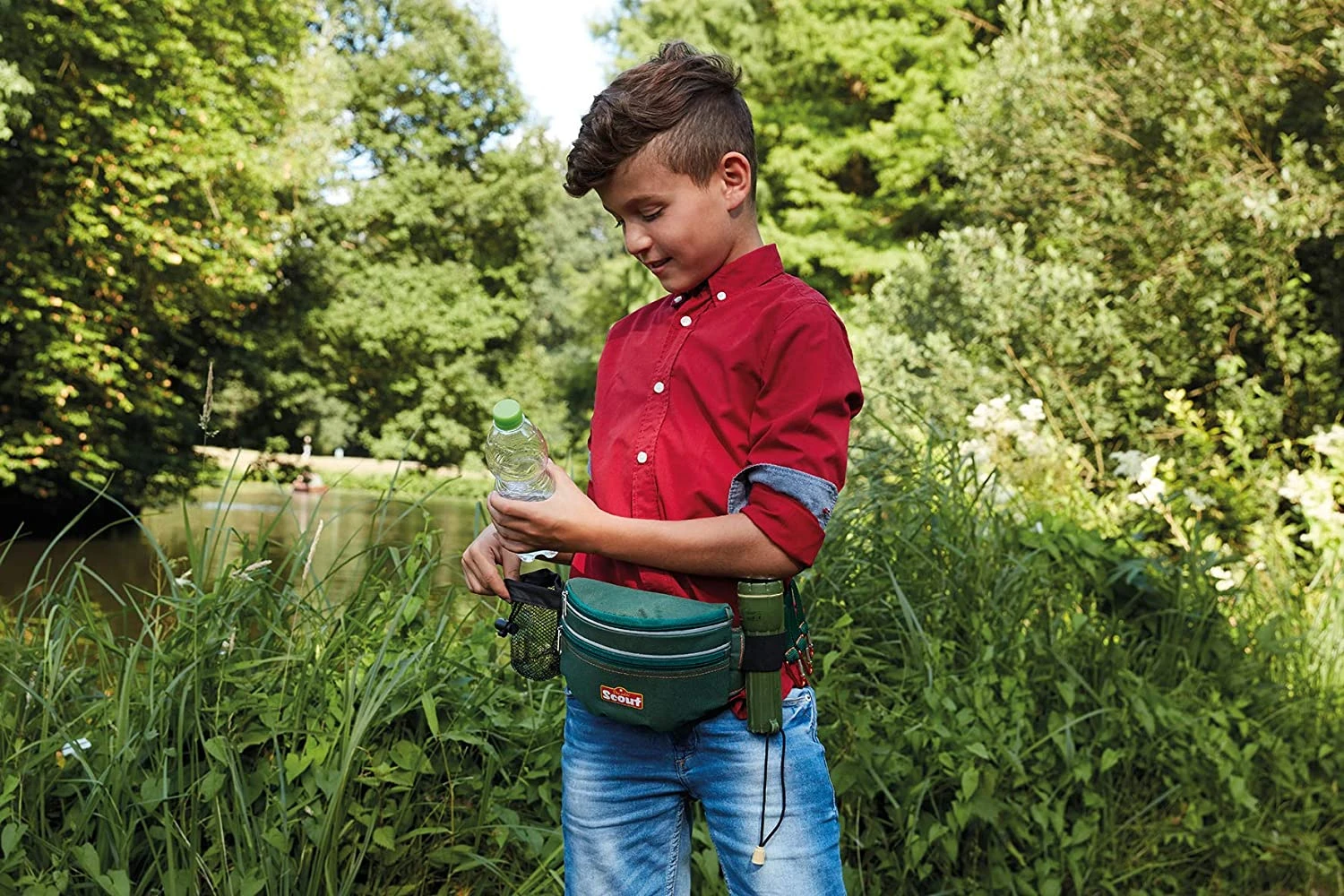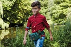 Heupgordel met zaklamp voor de echte natuurontdekker. Verstelbaar van 50 – 90 cm., Compleet met tasje voor kleine materialen, een bidonhouder en 3 karabijnhaken waaraan allerlei ontdekkersspullen zoals een kompas etc. bevestigd kunnen worden.