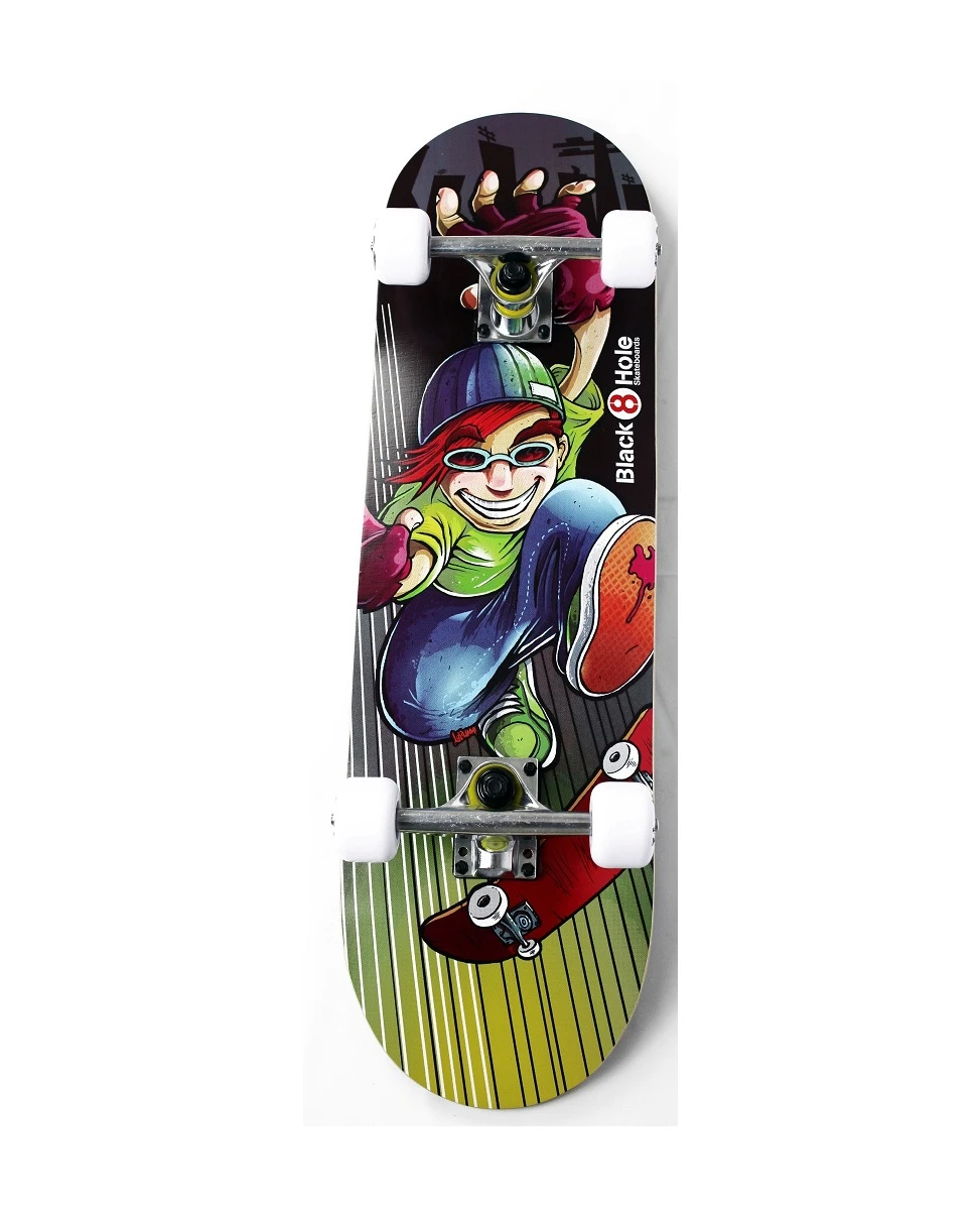 Het Skater Boy skateboard voor kinderen is een zogenaamd double kick tail board, wat gemaakt is van geperst hout. Het skateboard heeft twee stompe punten en is voorzien van griptape aan de bovenzijde voor een goede grip. Het onderstel is voorzien van 608Z kogellagers en soepele 92A wielen (54mm).
