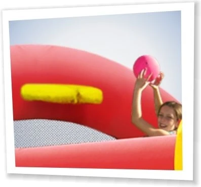 Een Happy Hopspringkussen met een glijbaan voor springplezier voor 2 kinderen tegerlijkertijd. Ideaal voor in de kleinere tuin.