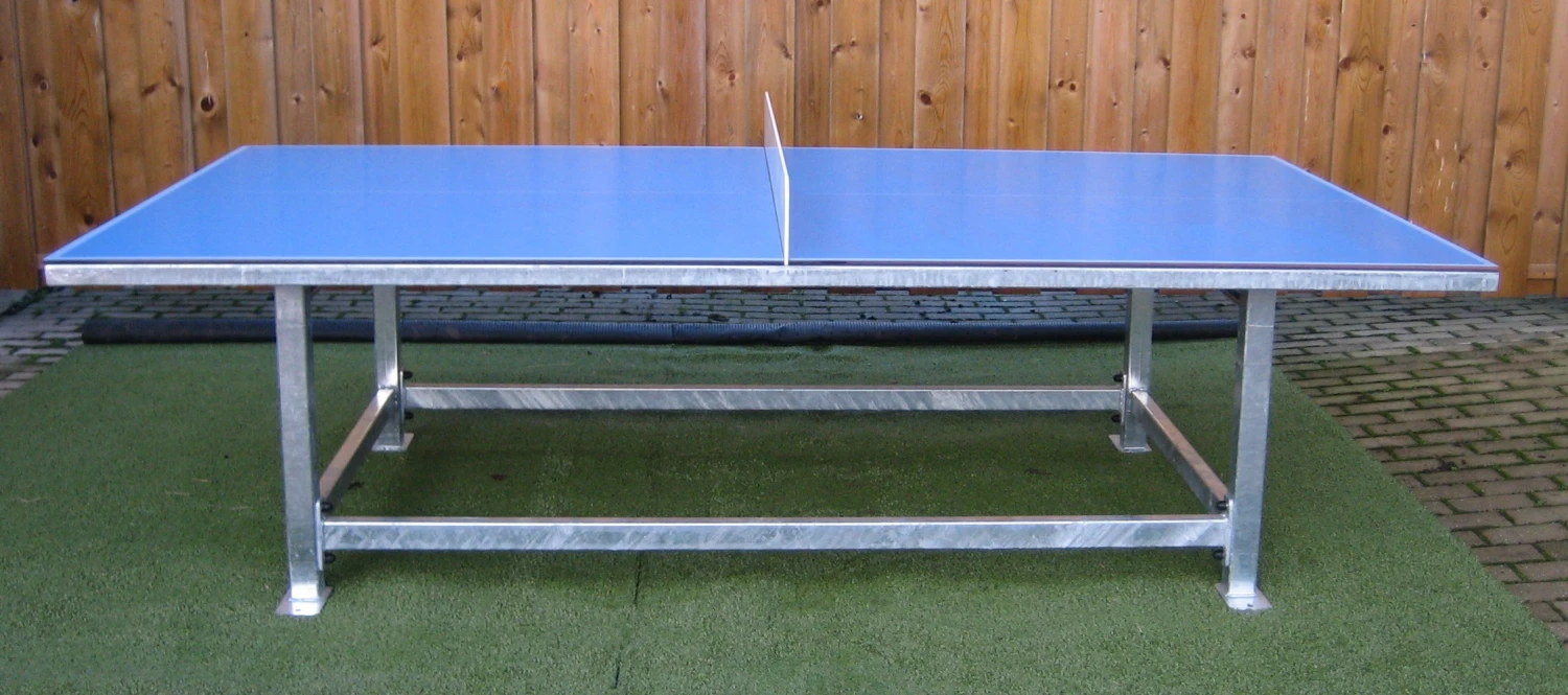 Degelijke tafeltennistafel voor buitengebruik. Deze tafel heeft een licht verzinkt stalen onderstel. Het professionele speelblad is van 8mm extoriet; een hard soort kunststof met ideale speeleigenschappen. Het speelnet van deze tafeltennistafel is van staal. Afmetingen van de tafel: 274×152,5 cm. Randlijst van kokerprofiel 40/40 mm.