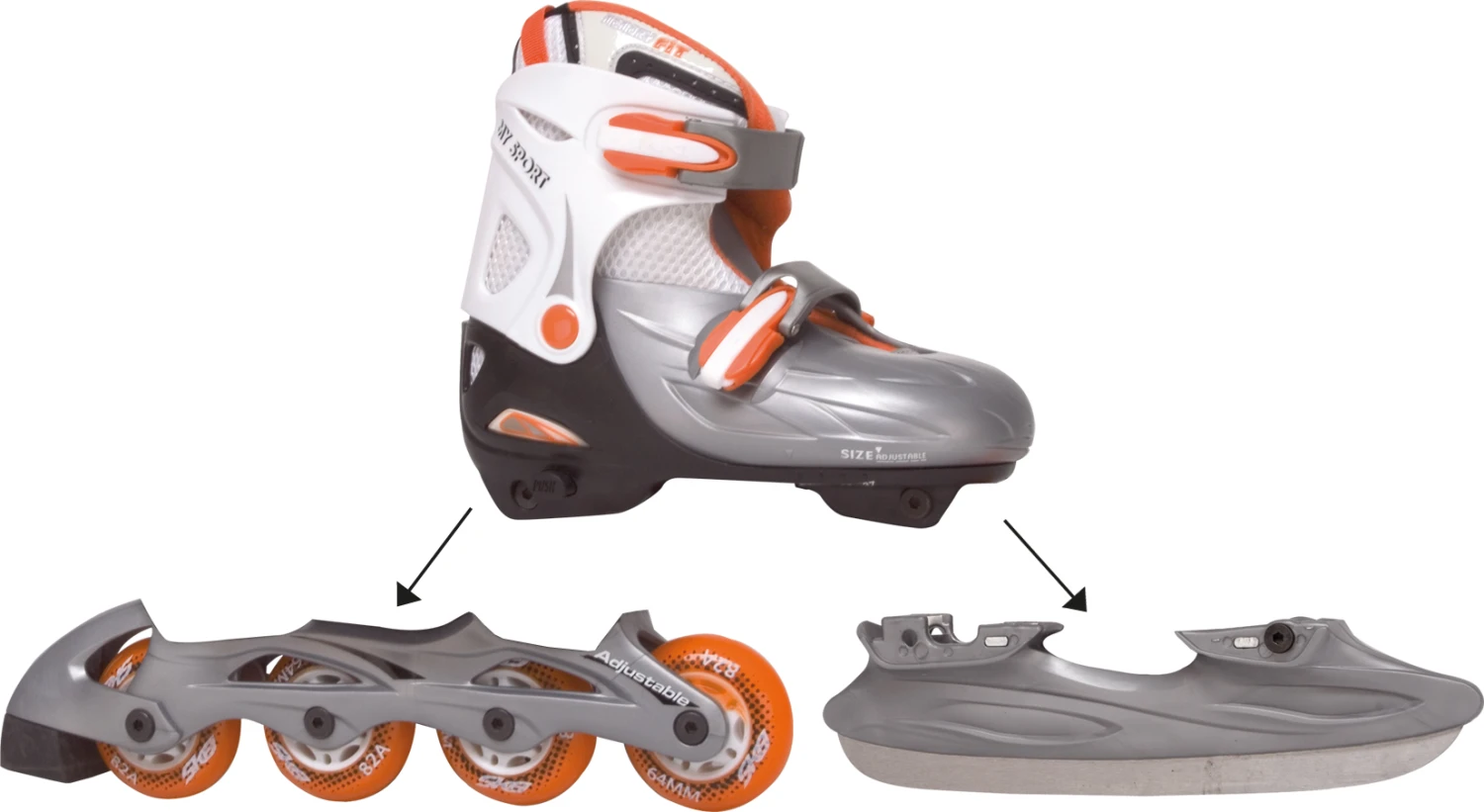 De “meest” ideale oplossing. Met deze set kan uw kind skaten in de zomer skaten en schaatsen in de winter. Eenvoudig om te bouwen en ook nog in maat verstelbaar.