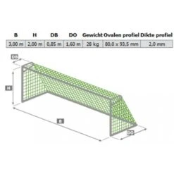 Professioneel aluminium voetbaldoel met een veilige afwerking zonder oogvijzen, afm. 3 x 2 m. Via een nieuw en ingenieus systeem is het doelnet namelijk verankerd in het aluminium doelkader.