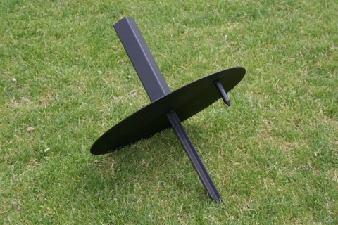 Deze voetplaat heeft een diameter van 50 cm. en is 3 mm. dik. De schijf is voorzien van een lange T-pin voor stevige verankering in de grond en een korte pin om eventueel draaien tegen te gaan. Geschikt voor gebruik op een grasondergrond.