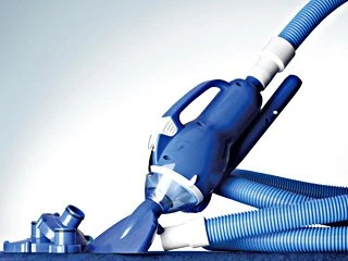 Zwembadstofzuiger voor opzetbaden tot een inhoud van 10 m3. De stofzuiger wordt aangesloten op de aanzuigkant van de filterpomp in de wand van het zwembad.